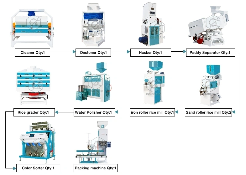 This flow chart explains the working principle of a rice mill. It greatly helps you understand the workflow and become familiar with the machinery.